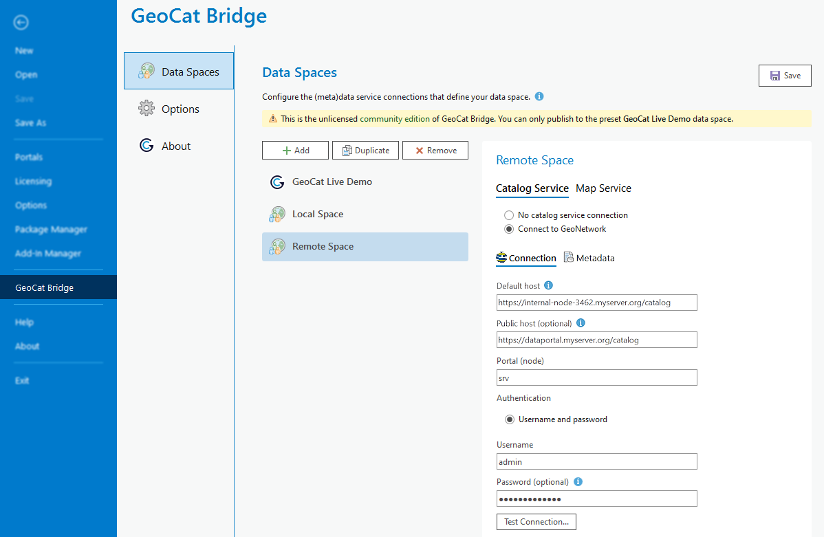 Community Edition users will see a fixed data space configuration (GeoCat Live Demo) here,