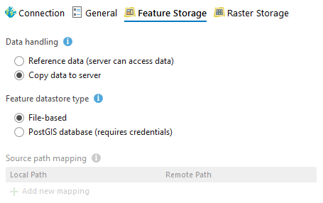 - Referencing a PostGIS database: this means that your map service (GeoServer) can access the same database as your ArcGIS Pro map. No data has to be copied online, GeoServer only needs to reference that table and publish a feature layer.