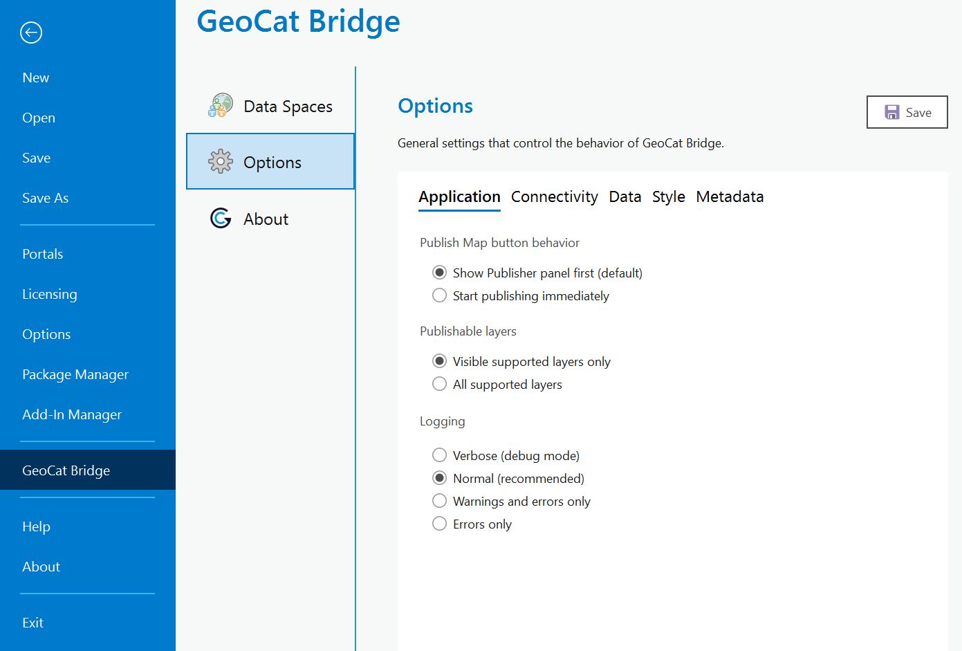 Some options in GeoCat Bridge are independent of the configured data space(s). These settings apply globally and affect the way how Bridge behaves or handles server communication, map publishing, and metadata.