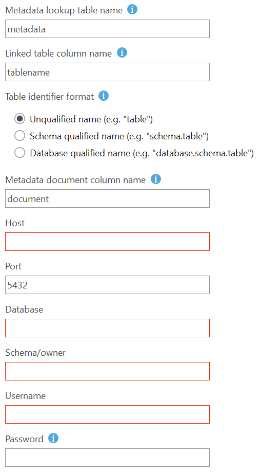 tablenamecolumn. This is especially required if your geodata is stored in a different database and/or schema than the metadata lookup table. - The table column name that stores the XML metadata record (default: