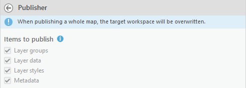 Publishes all (group) layers of the active map to the selected workspace, preserving existing workspace content. However, note that any layers and/or styles in the target workspace with the same name will be overwritten.